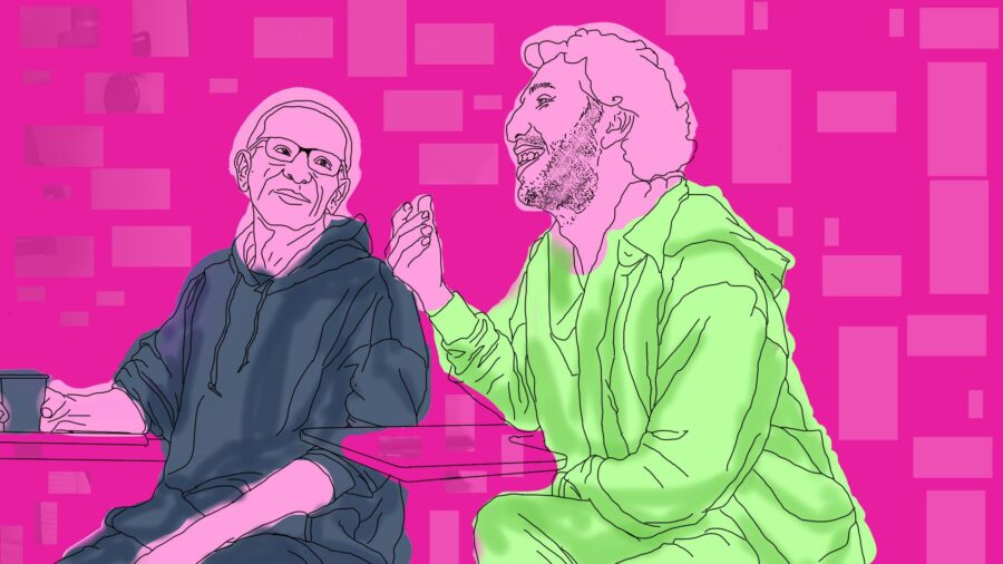 Ya con sus vasos vacíos y algo mordidos terminaron la conversación, pasaron sus contactos para quien quisiera indagar más, se despidieron de su amigo Cesar y de nosotros. Se besaron. Y salieron del salón después de contarnos de esa cercanía como otra de sus revoluciones. “Nosotros nos tocamos mucho. Todo el tiempo estamos cogidos de la mano. Nos besamos mientras esperamos el bus”, dijo Manuel. “Nos demostramos afecto donde sea”, sumó Víctor. “Entonces muchos de nuestros vecinos y vecinas decían: ‘Si estas locas, si estos maricas se cogen de la mano, yo por qué no volví a tocar a la mía’, la gente otra vez diciendo mi amor o volviendo a acuerdos que a lo mejor tuvieron cuando fueron novios, pero que no mantuvieron. Eso yo creo que es la verdadera revolución”.